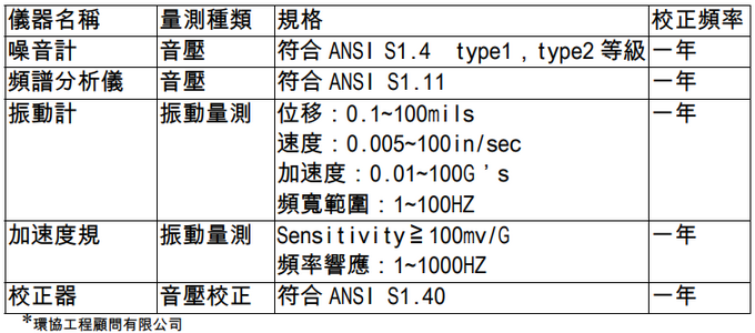 各種設備需符合的規格與校正頻率如表 3.1